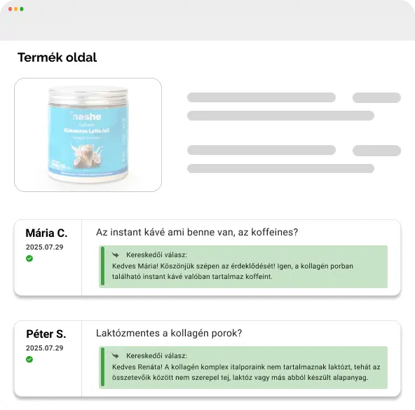 A látogatók kérdéseket tehetnek fel közvetlenül a termékoldalon. A válaszaid nemcsak őket segítik, hanem minden jövőbeli érdeklődőt is. A webshop válaszáról a kérdező értesítést kap, így valóban egy élő, bizalomépítő Q&A felület jön létre.