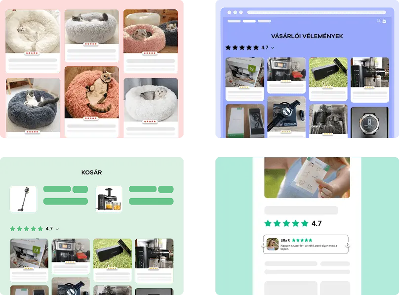 A véleményeket megjelenítheted a főoldalon, a termékoldalon, a kosárnál, vagy akár egy külön véleménygalériában is. Ha a látogató a főoldalon látja egy boldog vásárlód fotóját, nagyobb eséllyel kattinthat és rendelhet.
