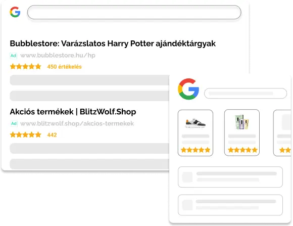 A termékeid csillagozott értékeléssel jelennek meg a Google keresőben és hirdetésekben is. Ez nemcsak jobb láthatóságot, hanem magasabb átkattintási arányt is jelenthet.